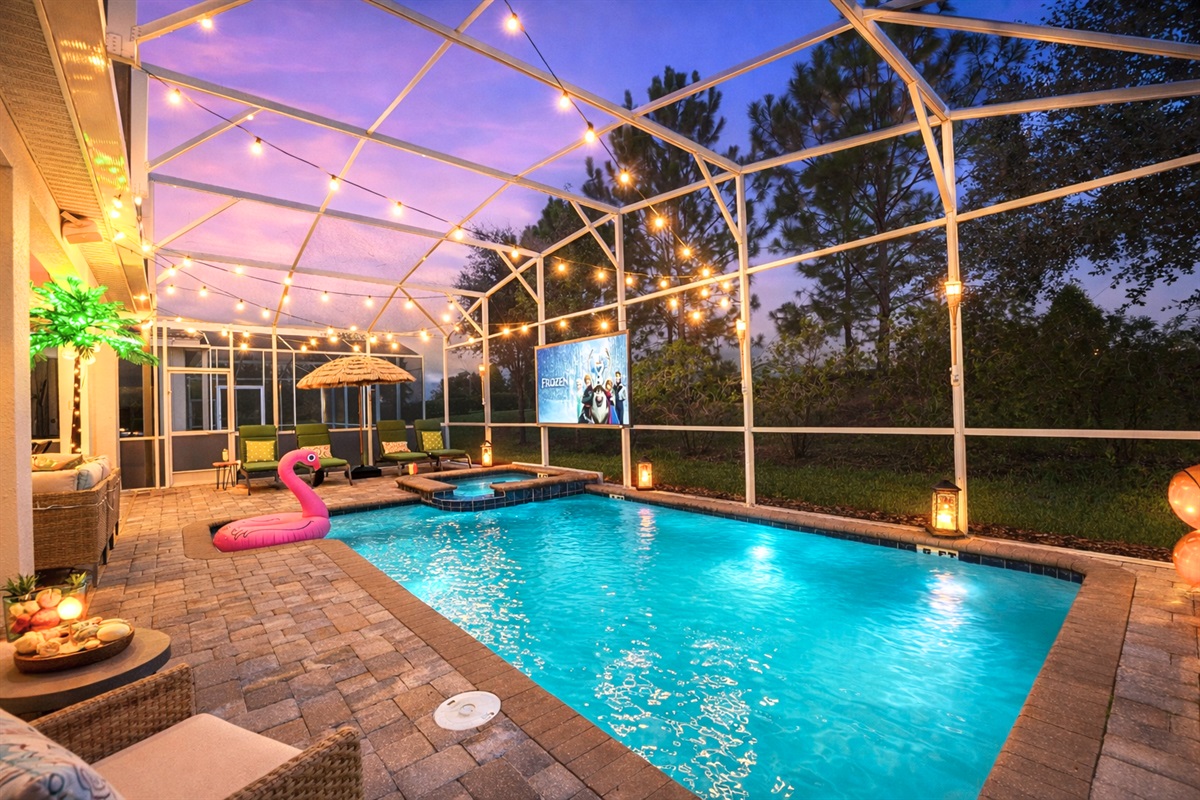 Step into a newly renovated tropical-themed lanai that feels like your own private island escape. Relax on the gorgeous new conversation set with plush couch seating, unwind under a thatched tiki umbrella, or sip your favorite frozen smoothie or tropical cocktail—there’s even a Ninja blender ready for whipping up fruity drinks. Two brand-new sun loungers invite you to soak up the Florida sunshine, while the existing outdoor projector, al-fresco dining for twelve, bamboo-accented lighting, and warm string lights create the perfect vibe for evening gatherings. Whether it’s movie night, cocktails, or a lazy afternoon, this lanai is ready for every tropical moment